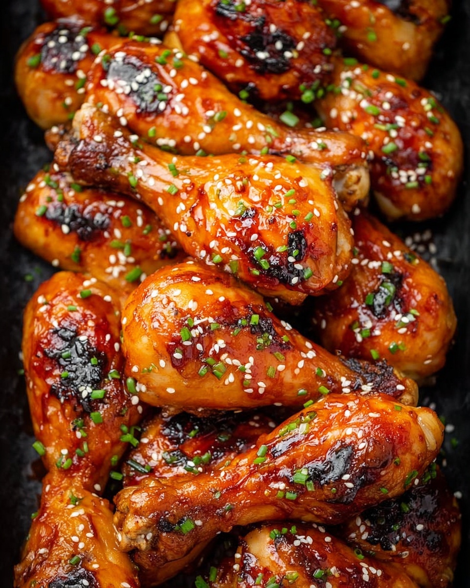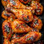 - Glaze and Garnish: Remove the chicken from the oven. Brush the thickened glaze generously over the drumsticks. Garnish with sesame seeds and chopped chives if desired. Serve warm and enjoy!