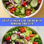 This Best Simple Side Salad is a fresh and vibrant mix of romaine lettuce, cherry tomatoes, cucumbers, red onions, and shredded carrots, topped with optional feta cheese and a tangy homemade dressing. Perfect for a quick and healthy side that complements any meal.