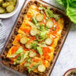 - Assemble and Serve: Once the casserole comes out of the oven, pour the prepared Big Mac sauce evenly over the top. Sprinkle shredded romaine lettuce and dill pickle slices over the sauce. Optionally, sprinkle 1-2 teaspoons sesame seeds for garnish. Serve immediately while warm.
