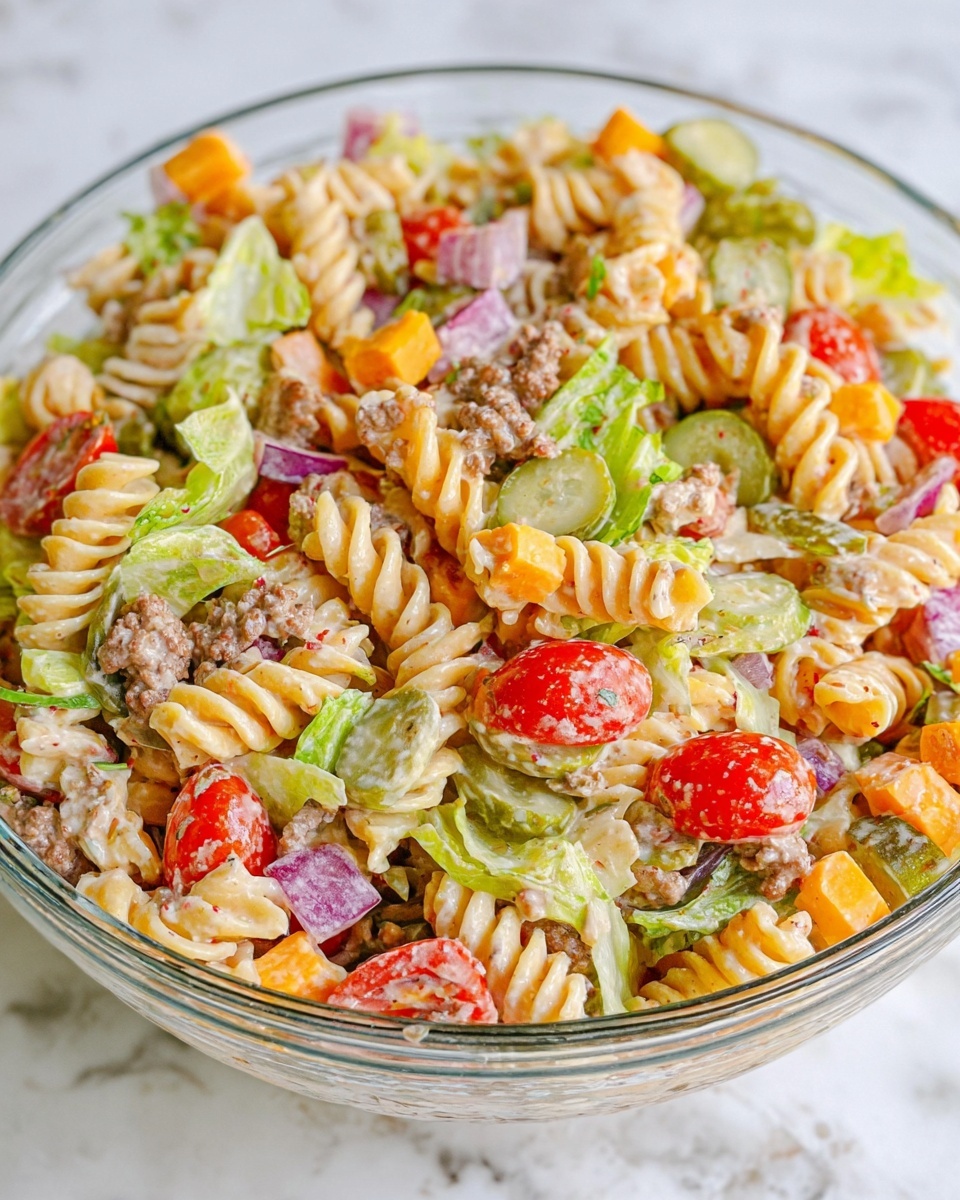 Now take a large serving bowl and toss together the cooked pasta, browned ground beef, diced cheddar cheese, halved cherry tomatoes, diced dill pickles, red onions, shredded lettuce, and the luscious dressing. Toss gently but thoroughly so every bit gets coated with that delicious dressing and the layers of flavor mingle perfectly. This step ensures every forkful is a balanced explosion of Big Mac nostalgia and fresh salad goodness.