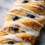 A delightful Blueberry Cream Cheese Pastry Braid featuring a flaky puff pastry filled with a creamy sweetened cream cheese layer and fresh blueberries, finished with a smooth vanilla icing drizzle. Perfect for breakfast or dessert, this recipe combines the richness of cream cheese with the freshness of berries in an elegant braided presentation.