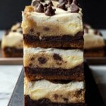 - Assemble the Bars: Press half of the cookie dough evenly into a parchment-lined baking pan to form the base layer. Pour the cheesecake filling over the base layer and spread carefully to avoid mixing the layers. Crumble or gently spread the remaining cookie dough over the cheesecake layer to create a marbled effect.