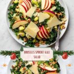 A vibrant and nutritious Brussels Sprout Kale Apple Salad featuring thinly sliced Lacinato kale and shredded Brussels sprouts, tossed with juicy Honeycrisp apples, toasted hazelnuts and walnuts, shaved parmesan, and a zesty lemon-olive oil dressing. This salad offers a delightful balance of crisp textures, nutty flavors, and tangy brightness, perfect for a healthy appetizer or light meal.