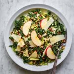A vibrant and nutritious Brussels Sprout Kale Apple Salad featuring thinly sliced Lacinato kale and shredded Brussels sprouts, tossed with juicy Honeycrisp apples, toasted hazelnuts and walnuts, shaved parmesan, and a zesty lemon-olive oil dressing. This salad offers a delightful balance of crisp textures, nutty flavors, and tangy brightness, perfect for a healthy appetizer or light meal.