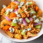 A flavorful and refreshing Buffalo Chicken Pasta Salad combining rotini pasta, shredded chicken tossed in spicy buffalo wing sauce, crunchy vegetables, and creamy blue cheese dressing. Perfect for a light lunch or a party side dish, this salad offers a delicious balance of heat and creaminess with a crisp texture from fresh celery, carrots, and bell pepper.