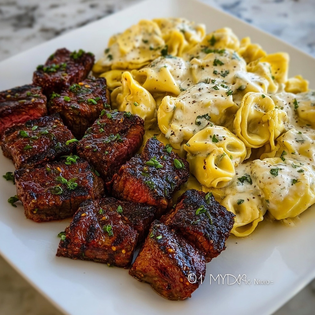 This dish is wonderfully satisfying on its own but pairs beautifully with a crisp green salad tossed in a tangy vinaigrette or roasted vegetables like asparagus or Brussels sprouts. These sides bring crunch and freshness that complement the creamy tortellini and spicy steak.