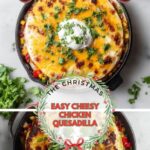 This Cheesy Chicken Quesadilla recipe features tender, seasoned chicken breasts cooked to perfection in a skillet, layered with a generous blend of cheddar and mozzarella cheeses, then baked until golden and crispy. Served with sour cream and fresh cilantro, it’s a deliciously satisfying meal perfect for any time of day.