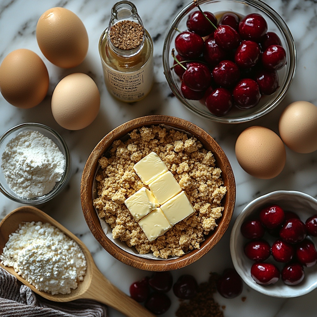 The ingredients for this Cherry Cheesecake Recipe are wonderfully straightforward, yet each one plays a crucial role in bringing the dessert to life. From the crunchy base to the silky filling and the vibrant cherry topping, every element contributes to a harmonious blend of flavor and texture.