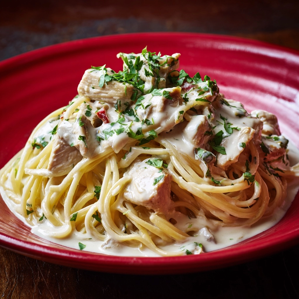 Chicken Tetrazzini is a creamy, comforting baked pasta dish featuring tender shredded chicken, mushrooms, peas, and spaghetti all coated in a rich Parmesan cream sauce, topped with melted mozzarella and crispy breadcrumbs. This hearty meal combines classic Italian-American flavors perfect for a satisfying family dinner.