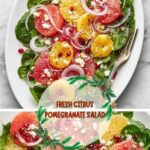 A refreshing Citrus Pomegranate Salad combining vibrant citrus fruits, crisp baby greens, tangy feta, and juicy pomegranate seeds, dressed in a zesty homemade lemon vinaigrette. Perfect as a light lunch or a festive side dish.