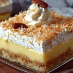 A deliciously layered coconut cream dessert featuring a buttery pecan crust, creamy cheesecake layer, smooth coconut pudding, and topped with toasted shredded coconut. Perfectly chilled for a refreshing and indulgent treat.
