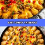 This hearty Cowboy Casserole is a comforting and easy-to-make dish featuring ground beef, creamy soups, corn, and crispy tater tots baked to golden perfection and topped with melted cheddar cheese. Perfect for family dinners, this casserole combines savory flavors and a satisfying crunch for a delicious one-dish meal.