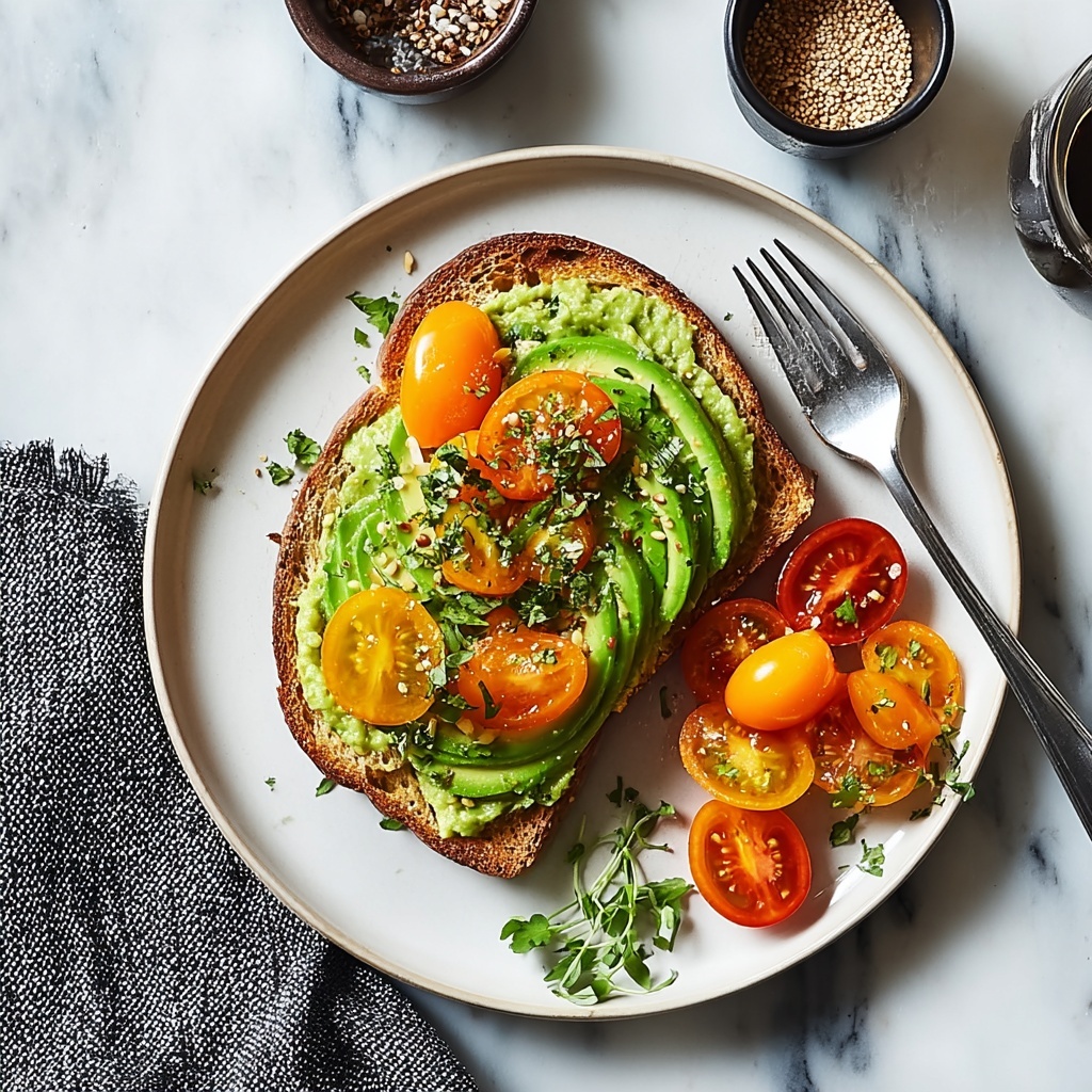 Top each slice with halved cherry tomatoes for juicy sweetness, crumbled feta cheese for a salty bite, and fresh basil leaves that bring a fragrant, herbal lift. This combination adds bursts of flavor and stunning color, turning your toast into a feast for both the eyes and the palate.