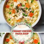 A rich and comforting creamy chicken pasta soup featuring tender chicken breasts simmered in a savory broth with aromatic herbs, combined with tender pasta, sweet peas, and finished with Parmesan cheese and fresh parsley for a hearty meal perfect for any day.