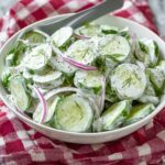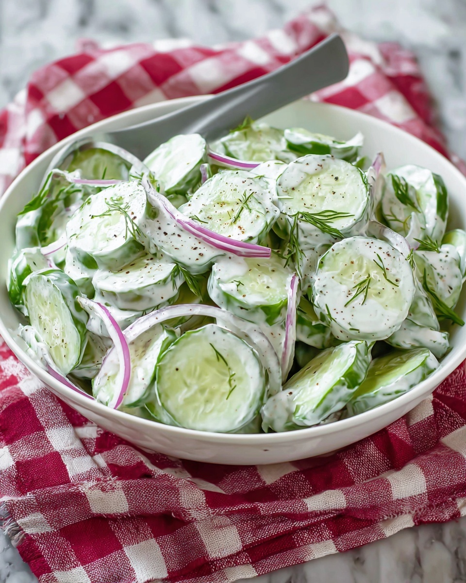 This Creamy Cucumber Salad is a refreshing side dish featuring thinly sliced cucumbers and onions tossed in a tangy sour cream and dill dressing. Perfect for warm weather and quick to prepare, this salad offers a cool, crisp bite with a creamy, flavorful dressing that complements any meal.