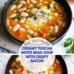 A rich and creamy Tuscan white bean soup featuring savory bacon, aromatic herbs, and Parmesan cheese. This comforting stovetop soup blends partially pureed white beans with heavy cream for a luscious texture, finished with fresh parsley and crispy bacon bits for a satisfying meal.
