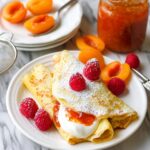 - Assemble the Crepes: Spread a thin layer of the Greek yogurt cream over each crepe. Roll the crepe or fold it into quarters with the cream inside. Optionally, top with apricot raspberry sauce and fresh berries before serving.