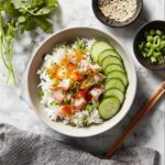 - Combine Salad Ingredients: In a large mixing bowl, combine cooled sushi rice, cucumber, cilantro, and toasted sesame seeds.