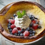 This Dutch Baby with Maple Whipped Cream is a fluffy, oven-baked pancake with crisp, golden edges and a soft, custardy center. Served warm and dusted with powdered sugar, it’s complemented perfectly by a rich, sweet maple-flavored whipped cream, making it an elegant yet simple breakfast or brunch option.