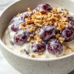 This Easy Grape Salad is a creamy, sweet, and crunchy dessert or side dish featuring red seedless grapes coated in a luscious cream cheese and sour cream mixture, topped with a brown sugar and toasted nut crumble. Perfectly chilled, it’s a refreshing treat ideal for potlucks, family gatherings, or a simple indulgence.
