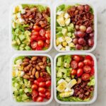 Divide your lettuce mix evenly among four lunch containers. Then, artfully layer the chopped bacon, eggs, avocado, tomatoes, almonds, and grapes on top. This not only makes the salad visually appealing but also means every bite offers a mix of fresh, creamy, crunchy, and juicy components.