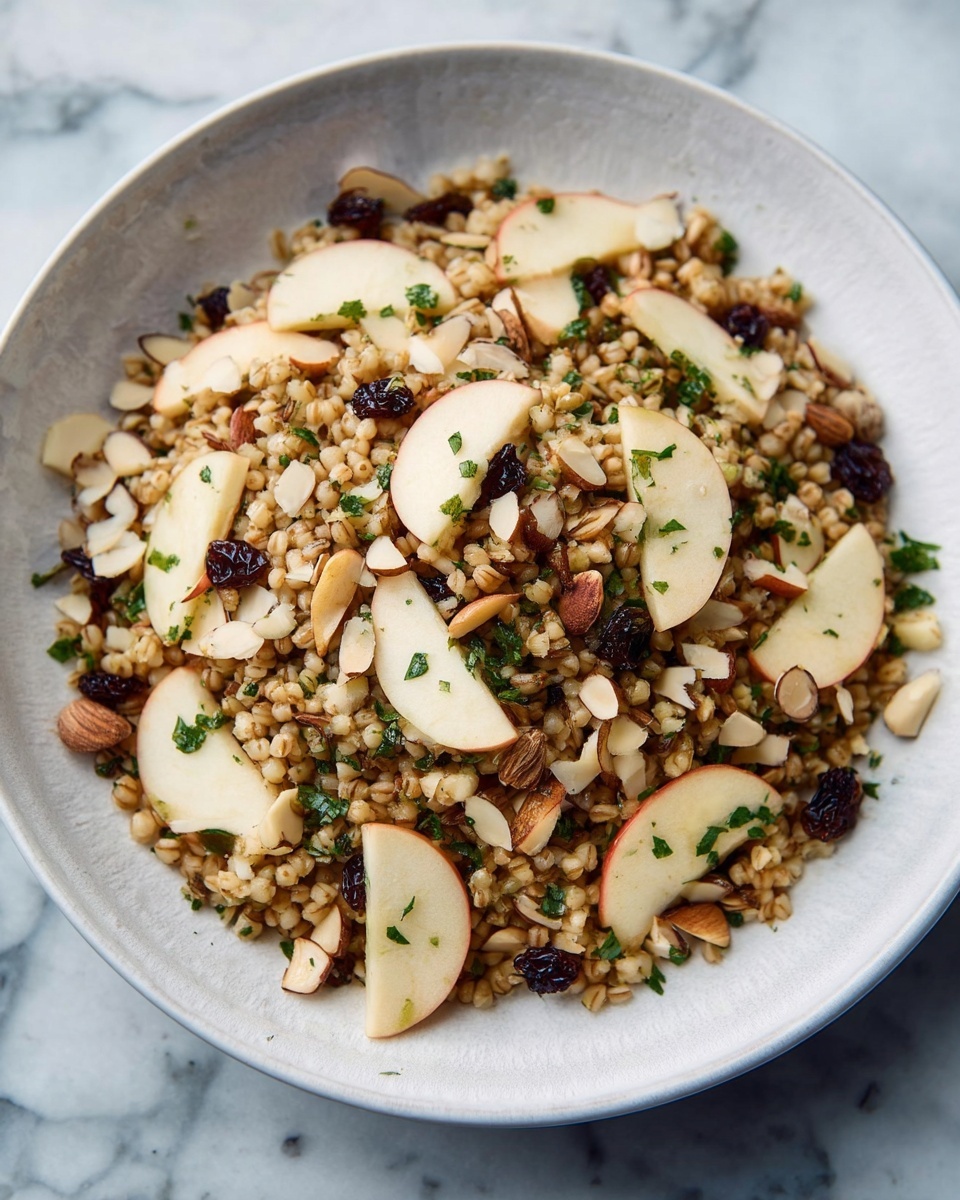 While the farro cools, take some time to prep the companion ingredients. Thinly slice or dice your honeycrisp apple for crisp bites, chop the fresh chives and parsley finely for bursts of herbal brightness, and have your almonds and dried cranberries ready to toss in. Each addition introduces color and texture contrast crucial to the salad’s charm.