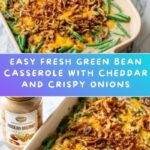 A fresh twist on the classic green bean casserole featuring tender green beans, creamy Portabella mushroom bisque, crispy French fried onions, and sharp cheddar cheese, baked to bubbly perfection for a comforting side dish.