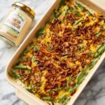 A fresh twist on the classic green bean casserole featuring tender green beans, creamy Portabella mushroom bisque, crispy French fried onions, and sharp cheddar cheese, baked to bubbly perfection for a comforting side dish.
