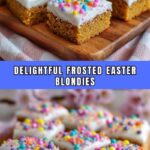 - Frost and Decorate: Spread the frosting evenly over the cooled blondies. Decorate with extra sprinkles or candy eggs to enhance the festive Easter theme.