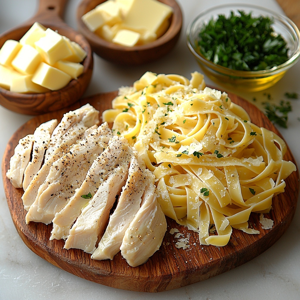 For a cozy dinner party, serve this dish in individual pasta bowls topped with parsley sprigs and a lemon wedge on the side for a subtle citrus twist. Alternatively, plate the chicken slices fanned out atop the pasta for an elegant presentation that’s sure to impress your guests.