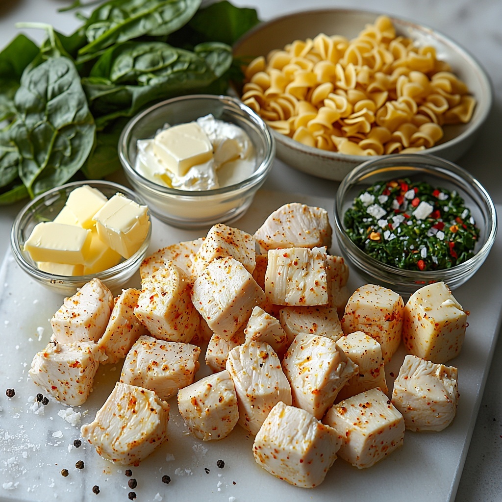 The beauty of the Garlic Cajun Chicken Bites with Creamy Spinach Artichoke Alfredo Pasta Recipe lies in its simple yet thoughtfully chosen ingredients. Each element plays an essential role—from the slightly spicy Cajun seasoning that flavors the chicken to the creamy cheeses that elevate the pasta. Together, they create a comforting dish full of texture and vibrant taste.