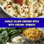 Delicious Garlic Chicken Bites served with a creamy Cajun Spinach Artichoke Alfredo Pasta. This quick and flavorful dish combines tender Cajun-seasoned chicken with a rich, cheesy Alfredo sauce infused with garlic, spinach, and artichoke hearts, tossed with perfectly cooked cavatappi pasta for a satisfying meal.