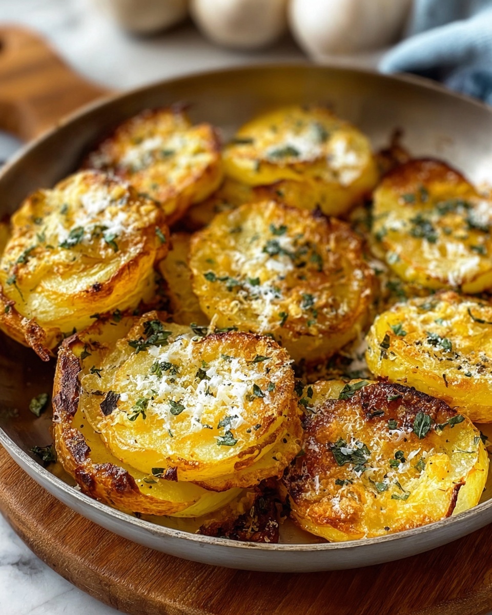 For a fun twist, serve these potatoes in individual mini cast iron skillets or on a rustic wooden board sprinkled with extra Parmesan and fresh herbs. You could even turn them into loaded bites with toppings like chives, cheese sauce, or caramelized onions for a crowd-pleasing appetizer.