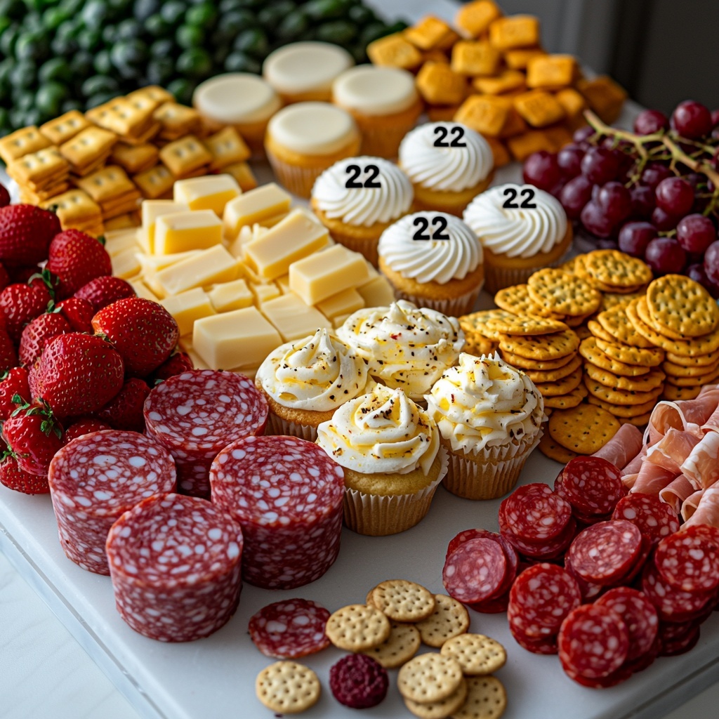 - Build the Board: Fill in all remaining spaces around the numbers with an artful grouping of cheese cubes, crackers, meat roses, mixed nuts, and assorted sweets such as cupcakes, Pirouettes, and candies. Aim for a balanced arrangement with a mix of colors and textures.