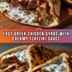 This Greek Chicken Gyros recipe features tender, marinated chicken thighs cooked to perfection and served in warm pita bread with fresh cherry tomatoes, red onion, lettuce, and a flavorful homemade cucumber tzatziki sauce. Topped with crumbled feta cheese, this dish offers a delightful Mediterranean-inspired meal that’s perfect for lunch or dinner.