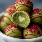 - Dip and Decorate: Dip each chilled truffle into the melted green candy melts, allowing any excess coating to drip off. Before the coating sets, place one red heart sprinkle on top of each truffle. Return the decorated truffles to the parchment-lined baking sheet.