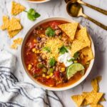 Don’t skip the garnishes! They enhance every bite by adding layers of texture and flavor. The sharpness of shredded cheddar cheese melting into the hot soup offers a rich finish, while a scoop of sour cream cools off the slight spice. Fresh cilantro adds an herbal brightness, tortilla chips provide a delightful crunch, and lime juice brings a refreshing zing that livens the entire bowl.