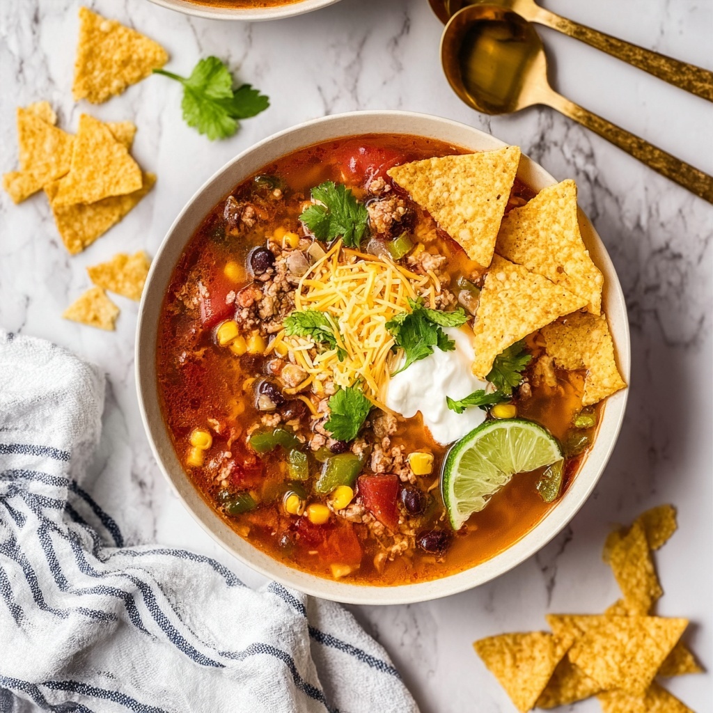 This Ground Turkey Taco Soup is a hearty, flavorful dish perfect for a quick weeknight meal. Packed with protein-rich ground turkey, beans, and vegetables, it combines classic taco seasoning with comforting soup ingredients. Topped with shredded cheddar, sour cream, fresh cilantro, tortilla chips, and a squeeze of lime, this soup brings a vibrant Mexican-inspired taste that is both satisfying and easy to prepare.
