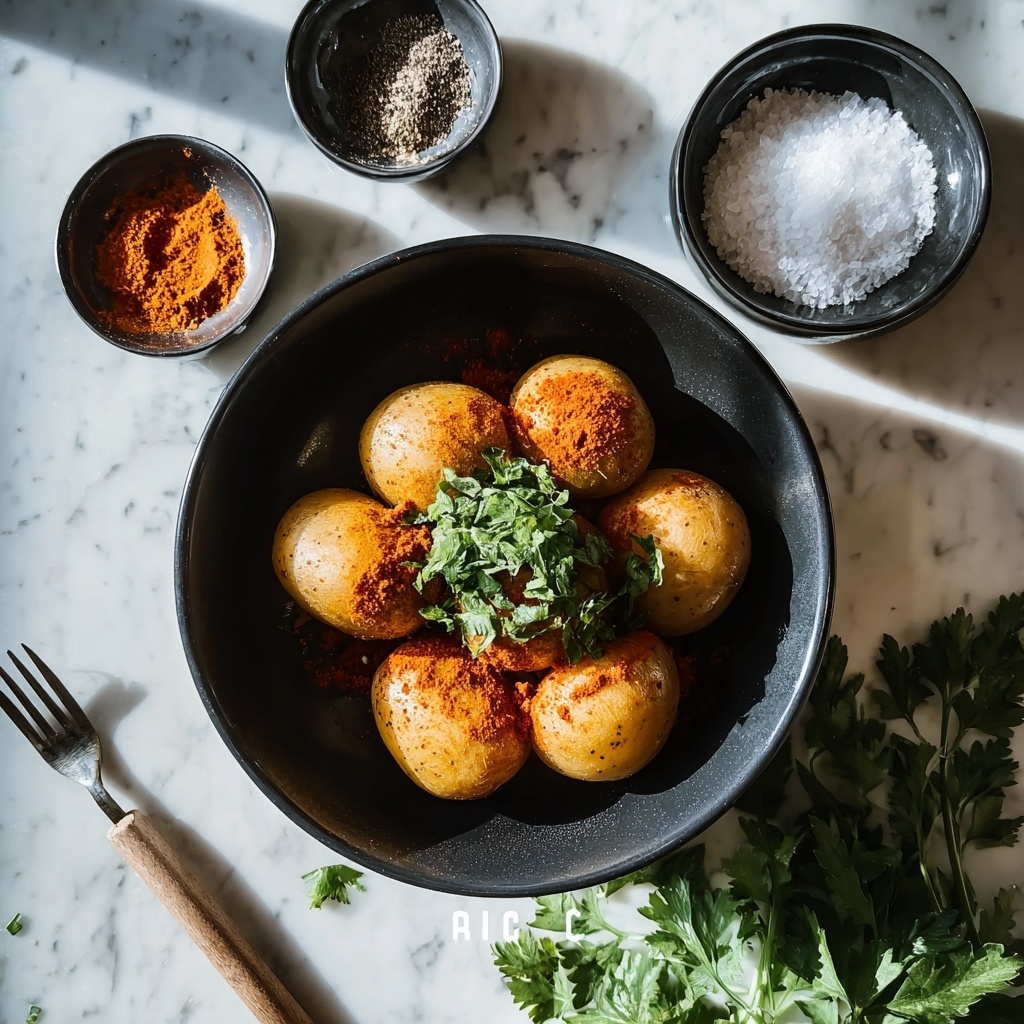 Fresh parsley is the classic green garnish that adds a touch of brightness and color contrast. For an extra festive touch, sprinkle some toasted sesame seeds or a handful of crumbled feta cheese over the potatoes. A drizzle of cooling Greek yogurt or a dollop of garlicky labneh can add a luscious balance to the spice.