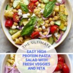 A vibrant and nutritious High Protein Pasta Salad featuring whole grain pasta, fresh vegetables, chickpeas, and a tangy lemon-Dijon dressing. Perfect as a wholesome lunch or side dish, this salad is easy to prepare and packed with flavor and protein.