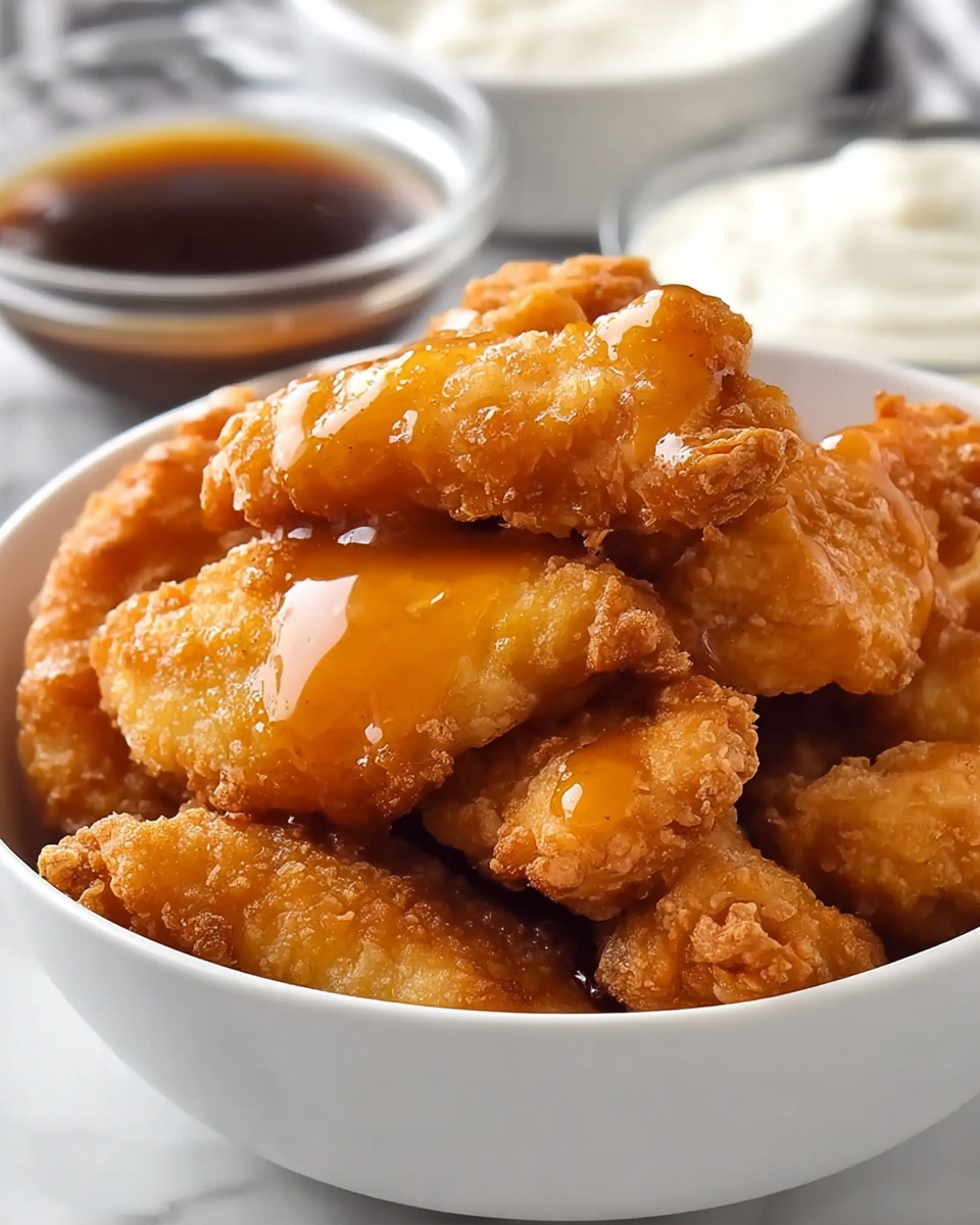 - Toss Chicken in Sauce and Serve: Place the fried chicken tenders in a large bowl, pour the hot honey sauce over them, and toss gently to coat evenly. Serve immediately while hot and crispy for the best flavor and texture.