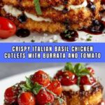 Italian Basil Chicken Cutlets with Tomato and Burrata Topping is a delightful main course featuring thinly pounded chicken breasts breaded and fried to golden perfection. Topped with a fresh and tangy combination of marinated cherry tomatoes, creamy burrata cheese, and fragrant basil, this dish offers a perfect balance of flavors and textures, making it an easy yet impressive Italian-inspired meal.