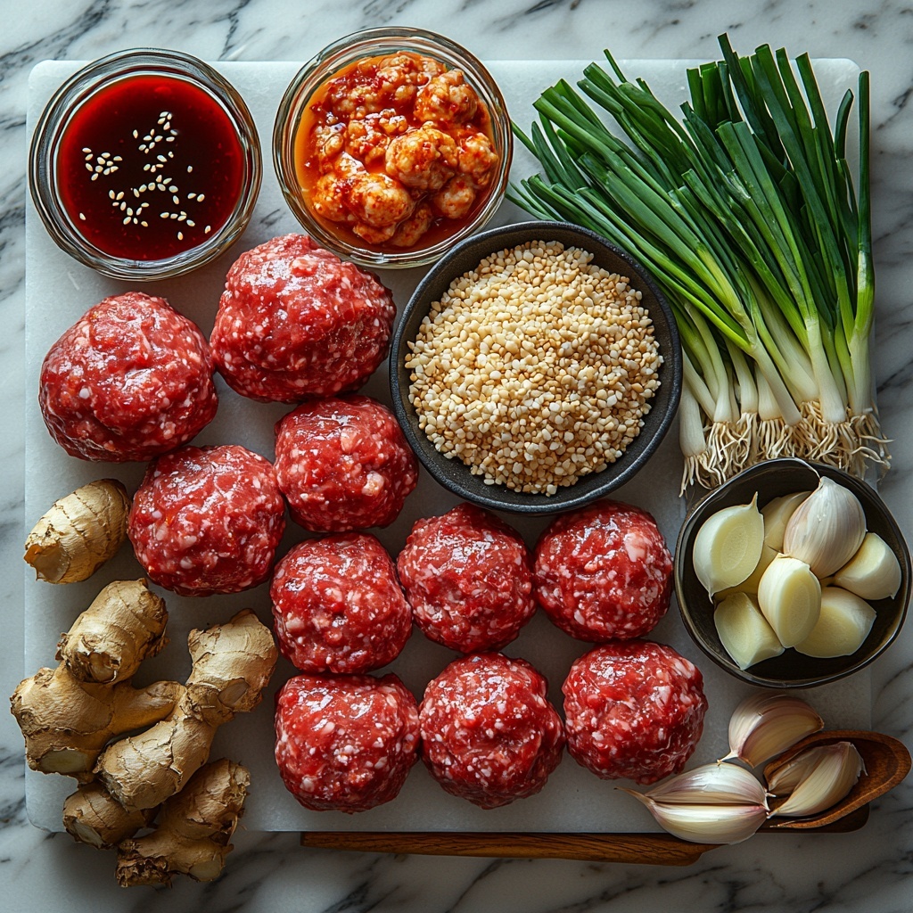 Gathering the right ingredients for this recipe is both simple and essential because each element plays a vital role in achieving the perfect balance of texture, flavor, and color. From the juicy blend of meats to the bold Korean BBQ sauce and zesty spicy mayo, everything works in harmony to create that unforgettable taste.