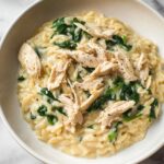 This comforting Lemon Chicken Orzo recipe combines tender shredded chicken with creamy, lemon-infused orzo pasta and fresh spinach. Cooked on the stovetop, it is a quick, flavorful meal perfect for weeknights that brings together bright citrus notes with savory parmesan and hearty chicken in a creamy, satisfying dish.