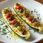 Serve these stuffed zucchini boats on a large platter sprinkled with extra chopped parsley and a drizzle of good quality olive oil. You can also scoop the filling onto individual plates and arrange the zucchini halves around it, turning the meal into a playful, interactive experience. For a vibrant party appetizer, cut the boats into smaller bite-sized pieces so guests can enjoy the Mediterranean magic in a single bite.