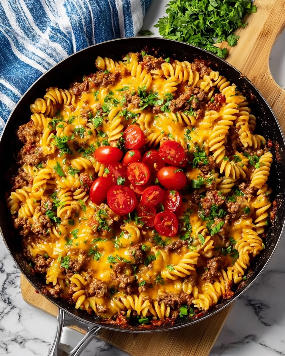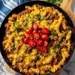 This One Pot Beef Enchilada Pasta combines the rich flavors of ground beef, enchilada sauce, and seasoned spices with tender rotini pasta, all cooked together in one skillet for a quick, comforting, and cheesy Mexican-inspired dinner.