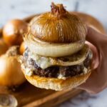 - Assemble the Burgers: On a clean surface or plate, place one onion ring as the bottom bun, add a cheese-topped beef patty, spread a generous amount of the prepared sauce over the patty, then top with another onion ring to complete the burger.