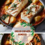 This Perfectly Grilled Cod with Homemade Romesco recipe features tender, flaky cod fillets grilled to perfection and served with a rich, smoky Romesco sauce made from roasted red peppers, almonds, garlic, and tomatoes. It’s a flavorful and healthy seafood dish that’s perfect for a quick weeknight dinner or a special occasion.