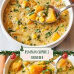 This Pumpkin and Chipotle Corn Chowder is a comforting and flavorful fall soup that combines sweet pumpkin, smoky chipotle peppers, and sweet corn kernels in a creamy broth. Made with simple ingredients and cooked on the stovetop, it’s perfect for a cozy meal and serves eight generously.