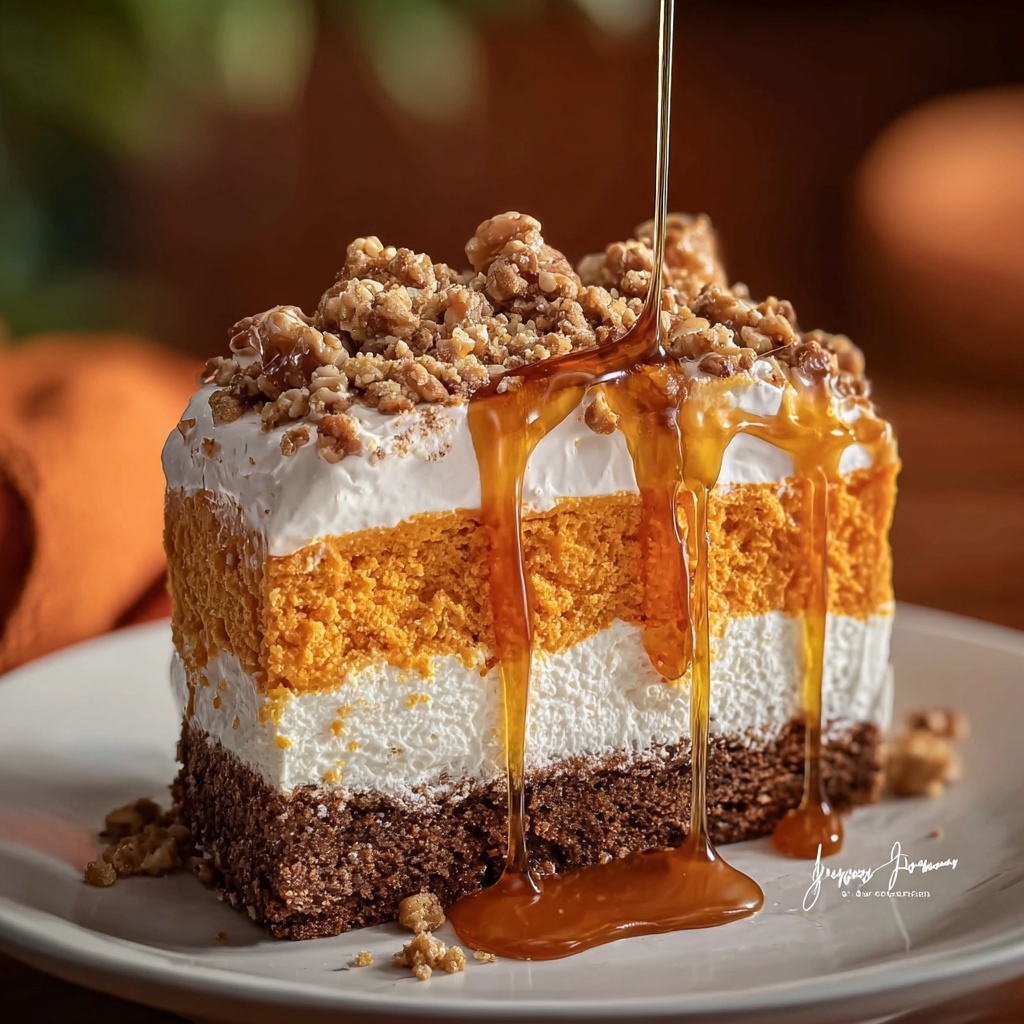 Once cooled completely, spread a generous layer of whipped topping across the surface. Next, drizzle caramel sauce over it for that iconic gooey sweetness that pairs so well with pumpkin. Finish by sprinkling toffee bits on top to add crunch and a delightful buttery flavor, making every forkful a little celebration.